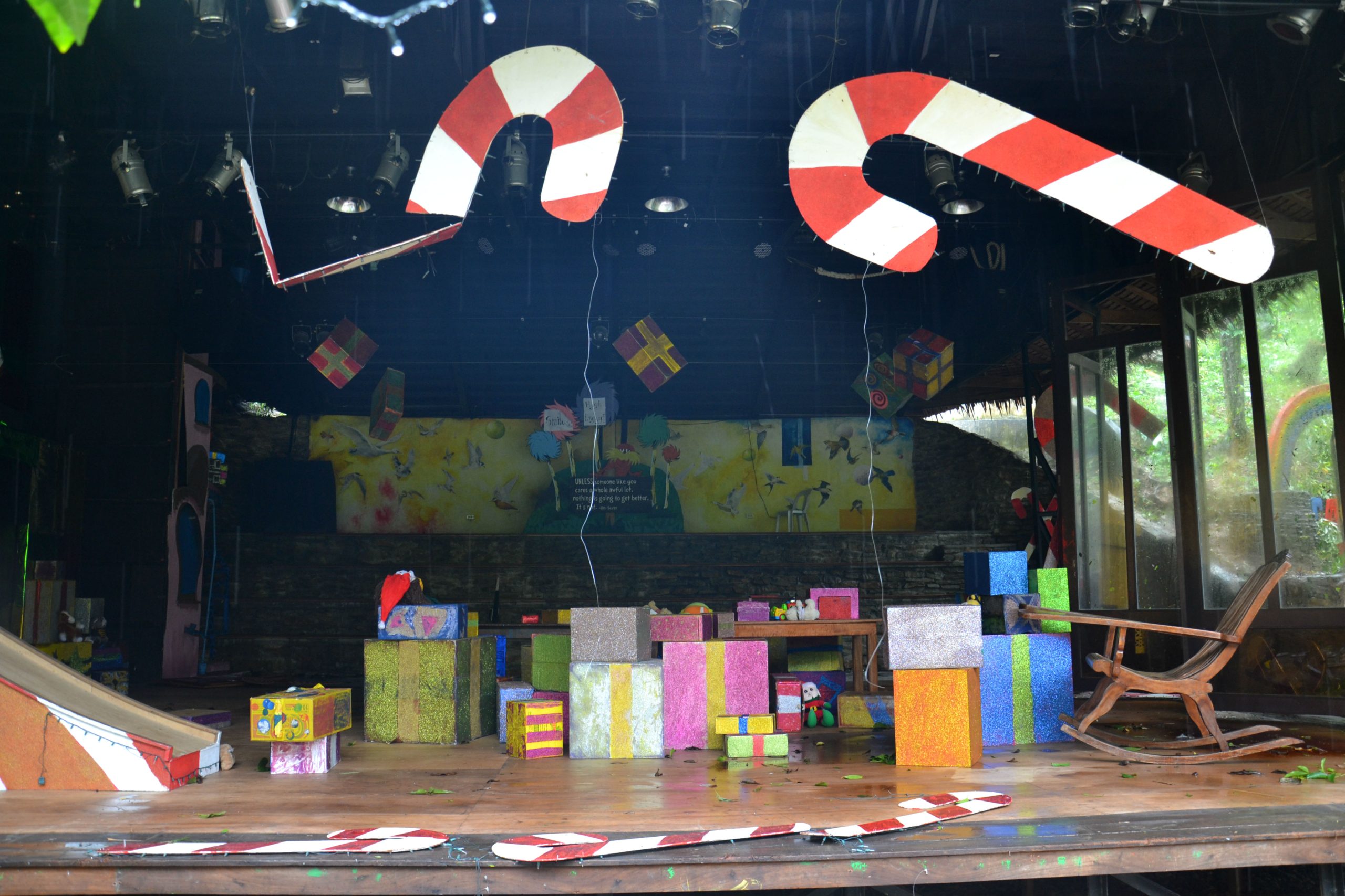 Concerning the strong spirit, we opened this year’s “One Wish” performance just before Christmas with the usual grandeur of sets, props and lighting. “Nina” changed all of that in minutes, when the metal/Plexiglas doors of the stage were pulled out of their sockets and bent or unhinged, as the wind and the rain raged through and left sets, props and lights in a chaotic and miserable condition. But, the show must go on! So, Santa and his elves got together, and with lots of determination and hard work they restored almost everything within just 24 hours. With only one cancellation, the kids were back on the stage to complete this season’s round of performances.